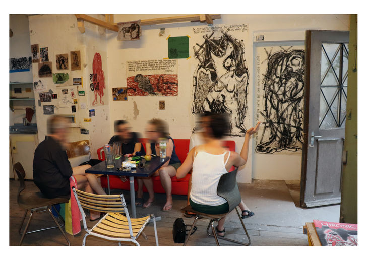 Media: painted banners, posters by black pigment bind with distemper and red, blue and brown Stainer on handwoven and rough cotton cloth, painted illustrations by gouache and Ink on rice-paper, permanent marker and ink drawings on printed flyers, leaflets, postcards, packing boxes cardboard sheets, tobacco packet and paper egg crate; handwritten text on the wall, collected propaganda materials related to immigration, racism, asylum, deportation, such as magazines, books, leaflets, stickers, flyers and badges; performative activities and discussions.