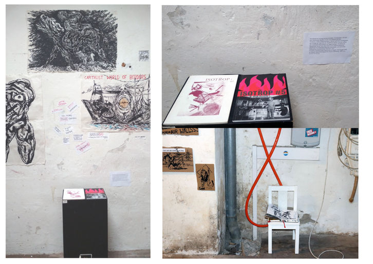 I collected flyers, advertisements and media from the local art scene and noticed that topics like the recent immigration/asylum policies, deportation and racism were virtually absent. Through reading local news, conversations and engaging with different political groups in the area, and looking at counterpropaganda practices like protest sticker culture and underground/alternative magazines and newsletters, I decided to superimpose political imagery, slogans and quotations onto the collected material such as display boards and walls. These works and reflections were incomplete and thus ongoing.
